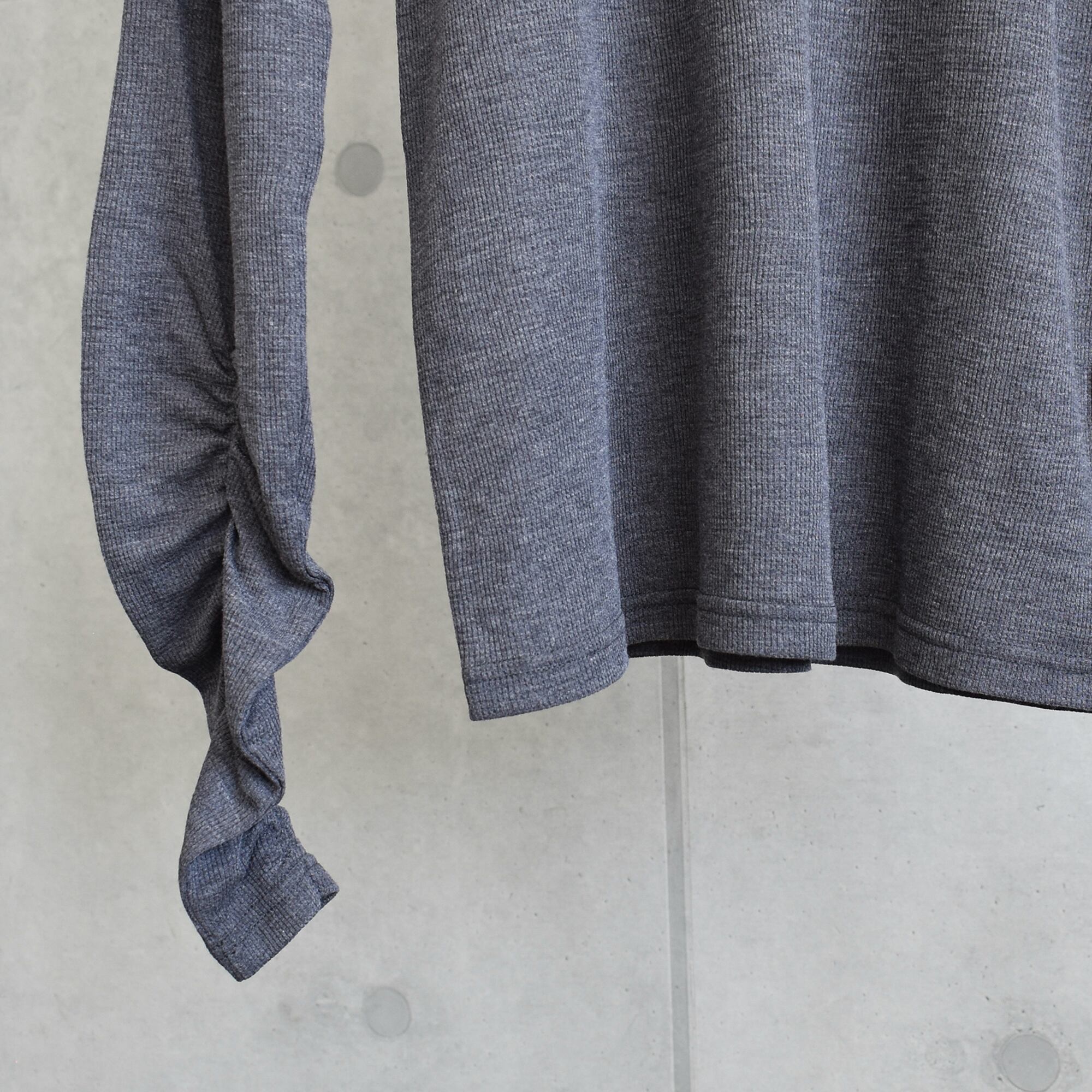 袖口のギャザーデザインがさりげないポイント、気になる二の腕やバストまわりには程よいゆとりをプラス。体のラインを拾いすぎず、安心感のある着心地です。
