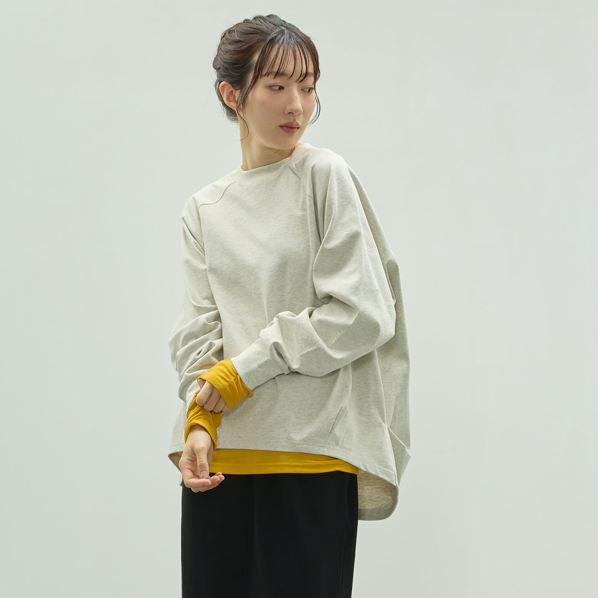 ラグランスリーブの切り替えで肩周りが華奢に見え、詰まった首元や袖口とのバランスも抜群。