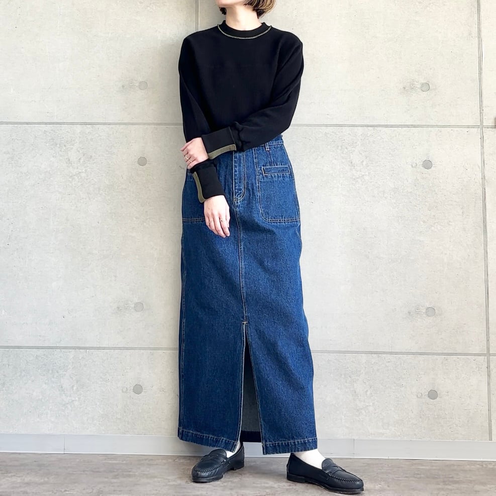 太めのリブで詰まったネックラインに、ややコンパクトなシルエットで大人っぽく着られる