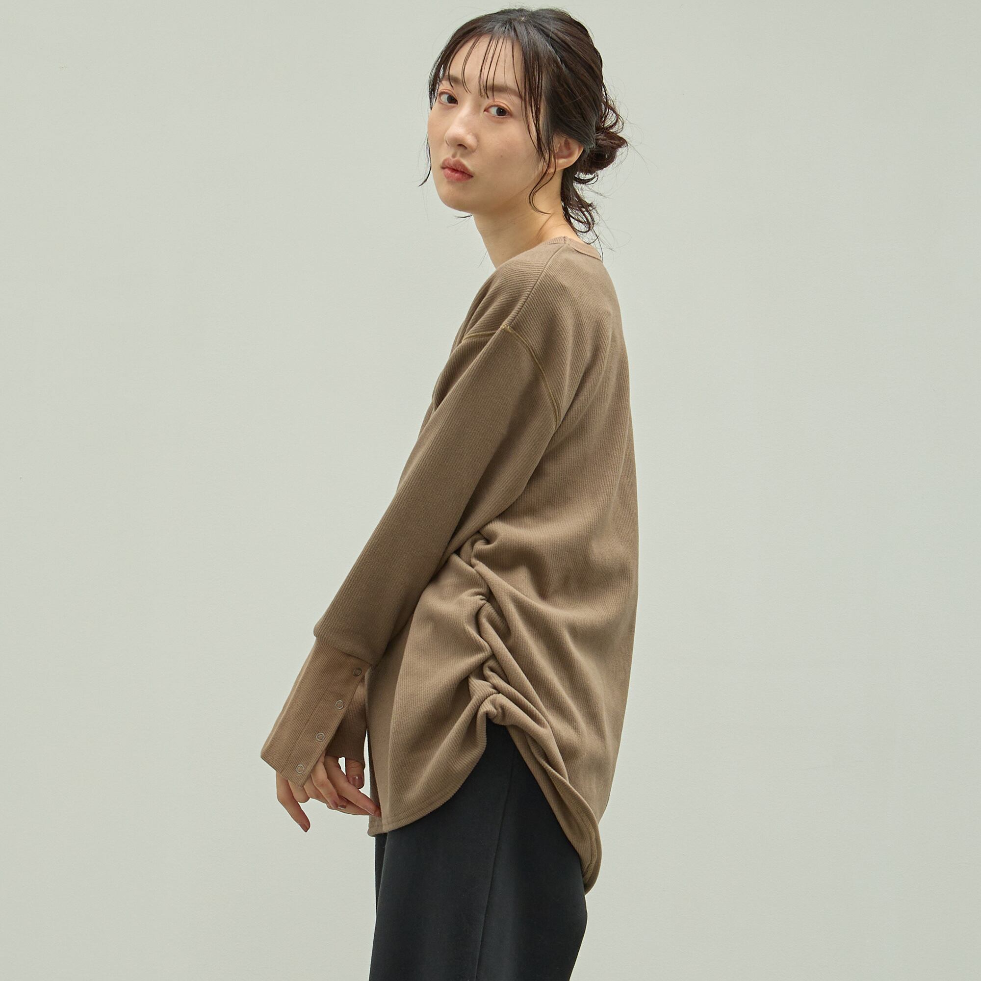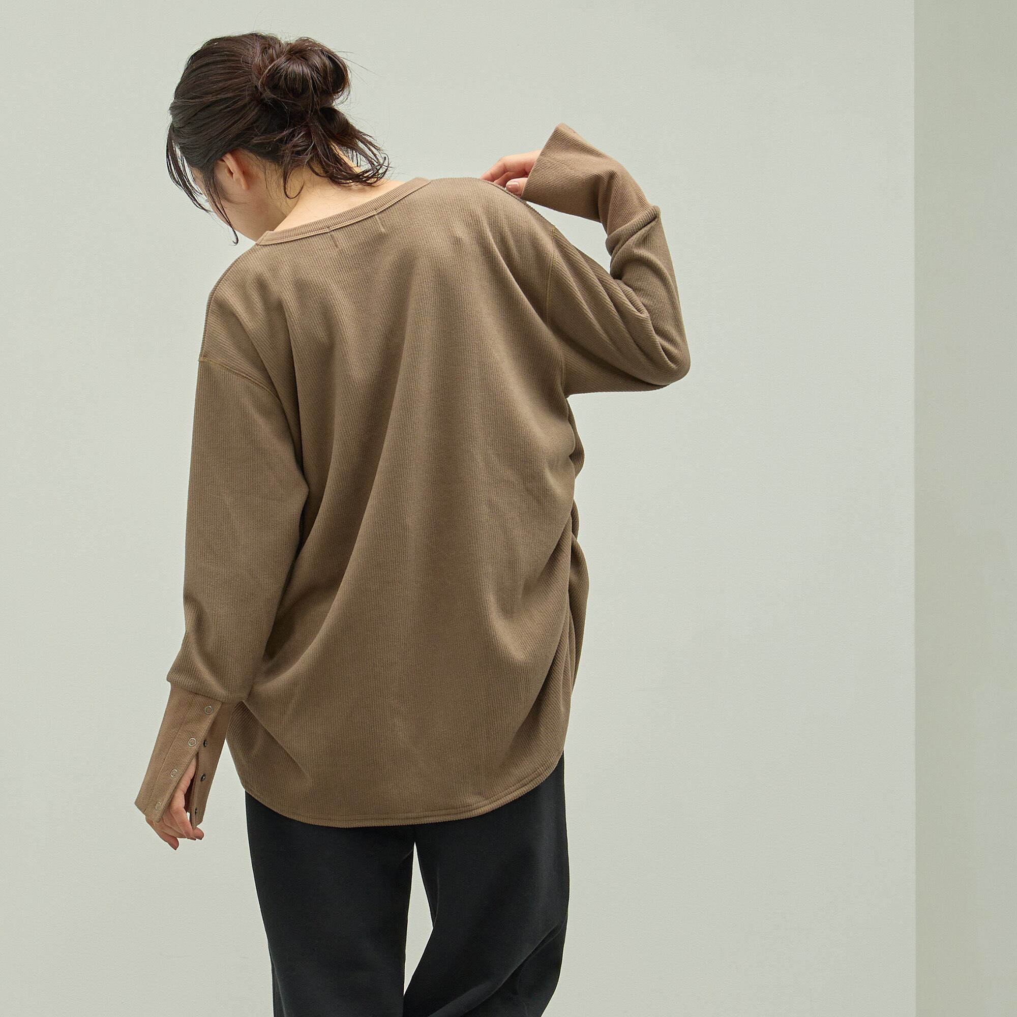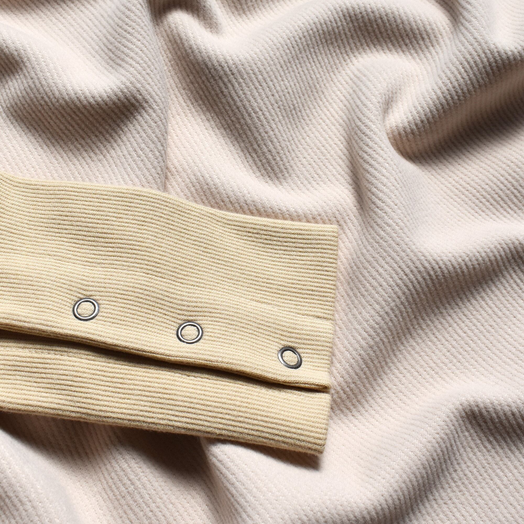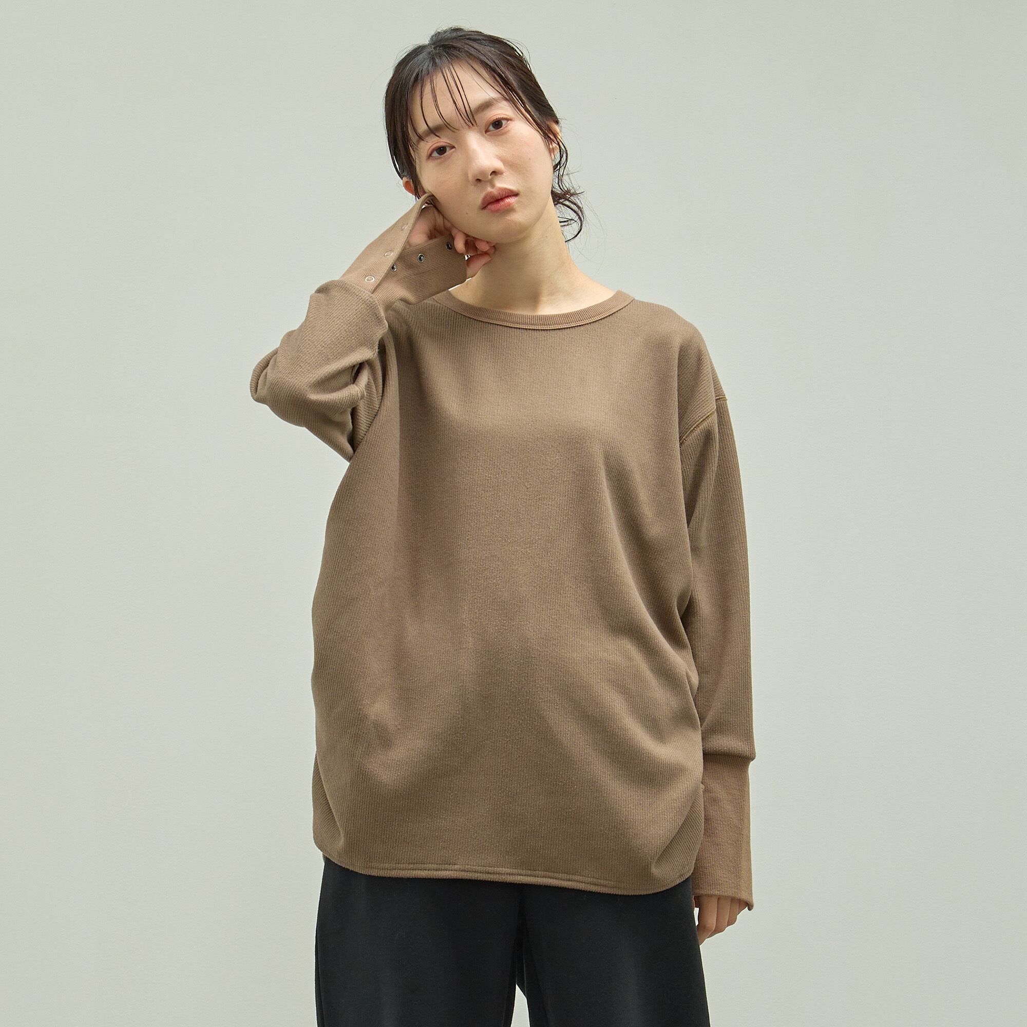 袖口の長めリブにはボタンを添えてさりげないアクセントを。