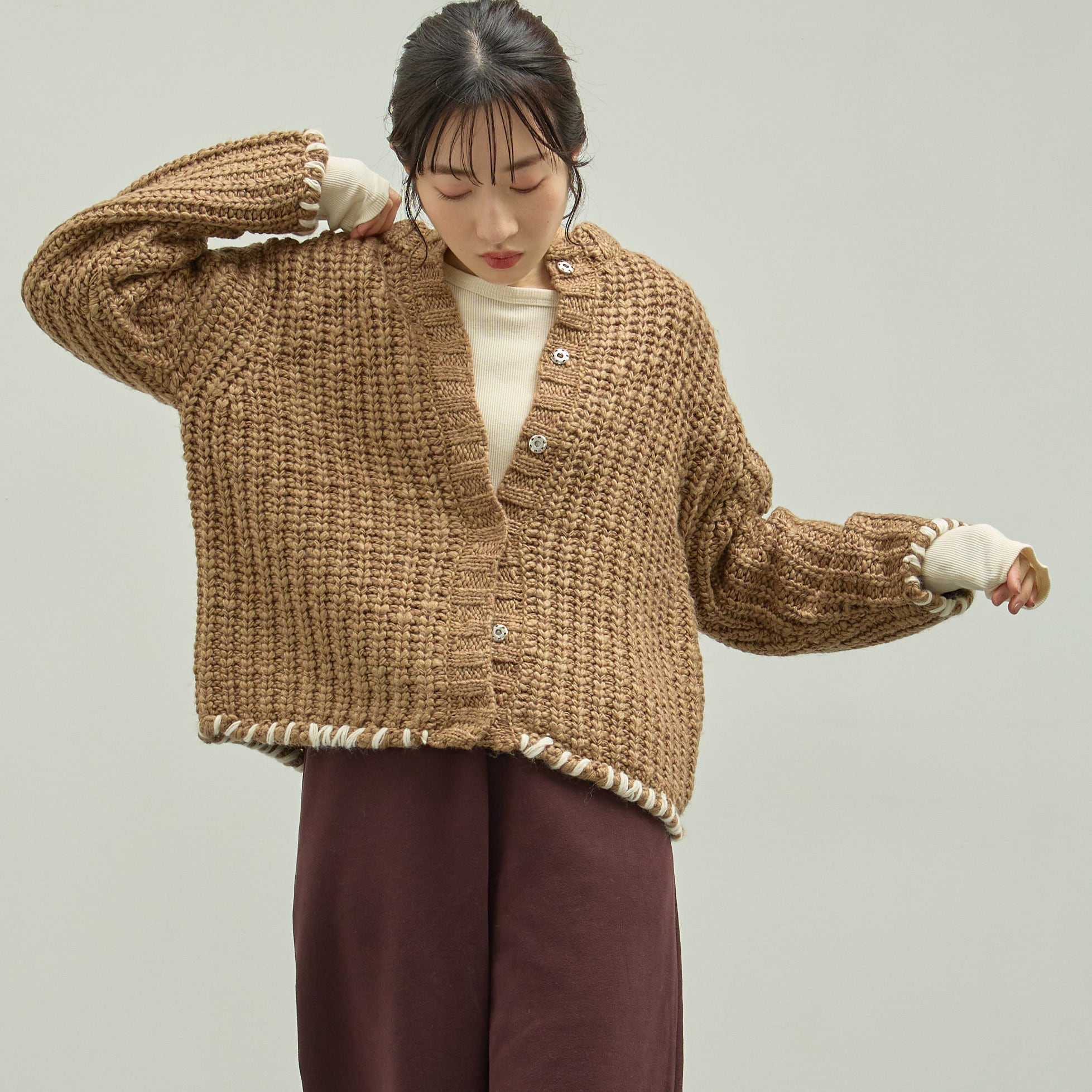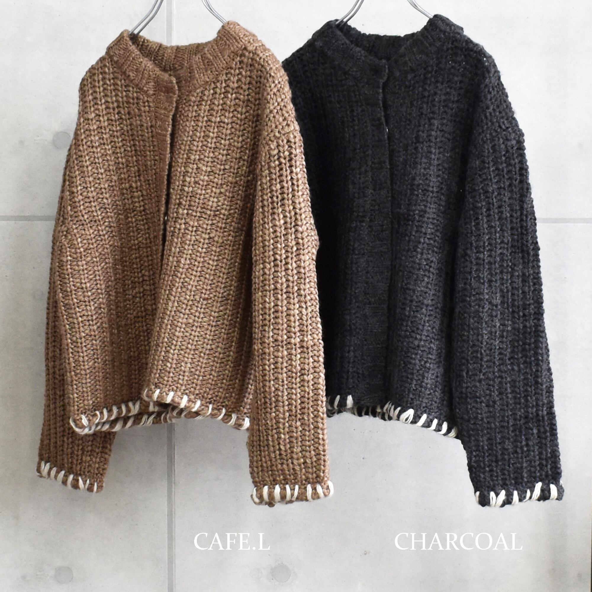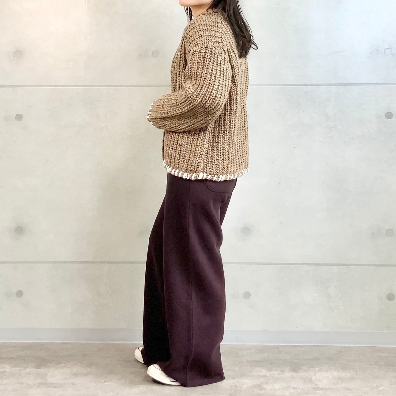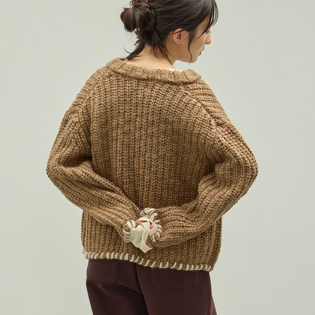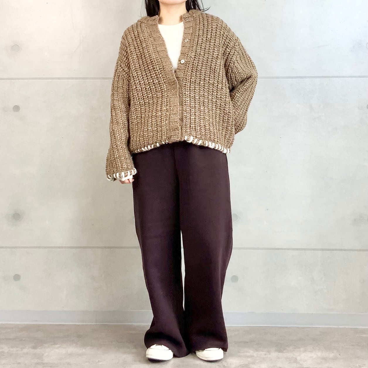 ふんわりと空気を含んだような、手編み風の優しい表情に仕上げたカーディガン。