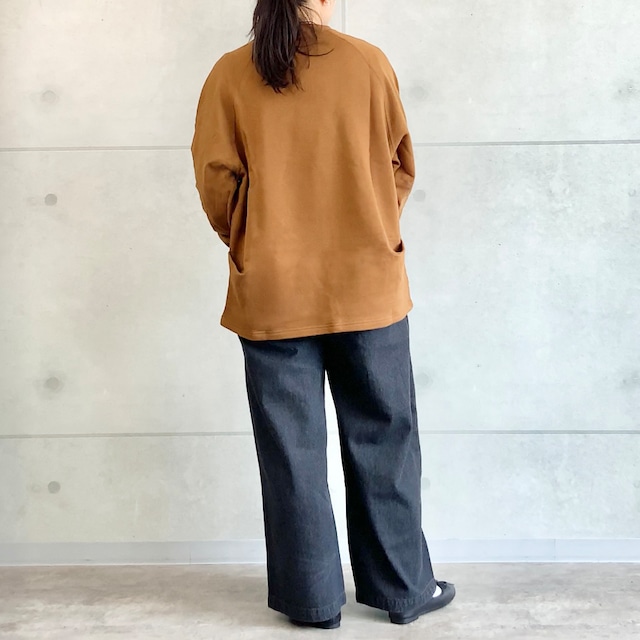 ラグラン切り替えが肩まわりをすっきりと見せ、詰まり気味のネックや袖口との