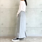 同素材のトップスとのセットアップスタイルもおすすめです。