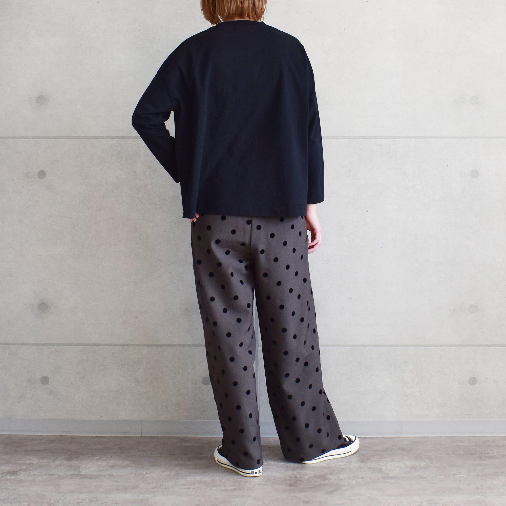 ワイドフレアロンTeeと同デザインの、シンプルなプリントを施したプリントTee。