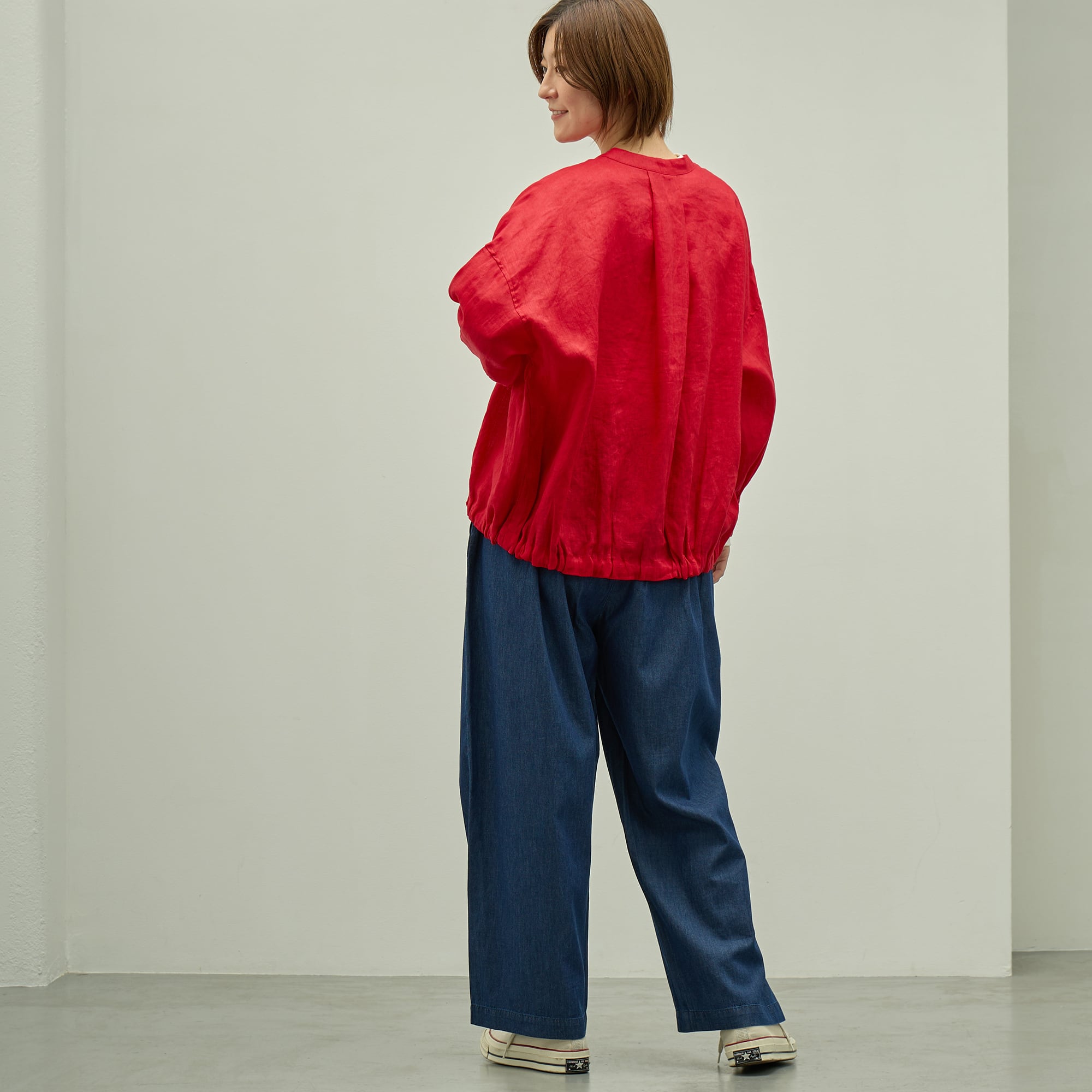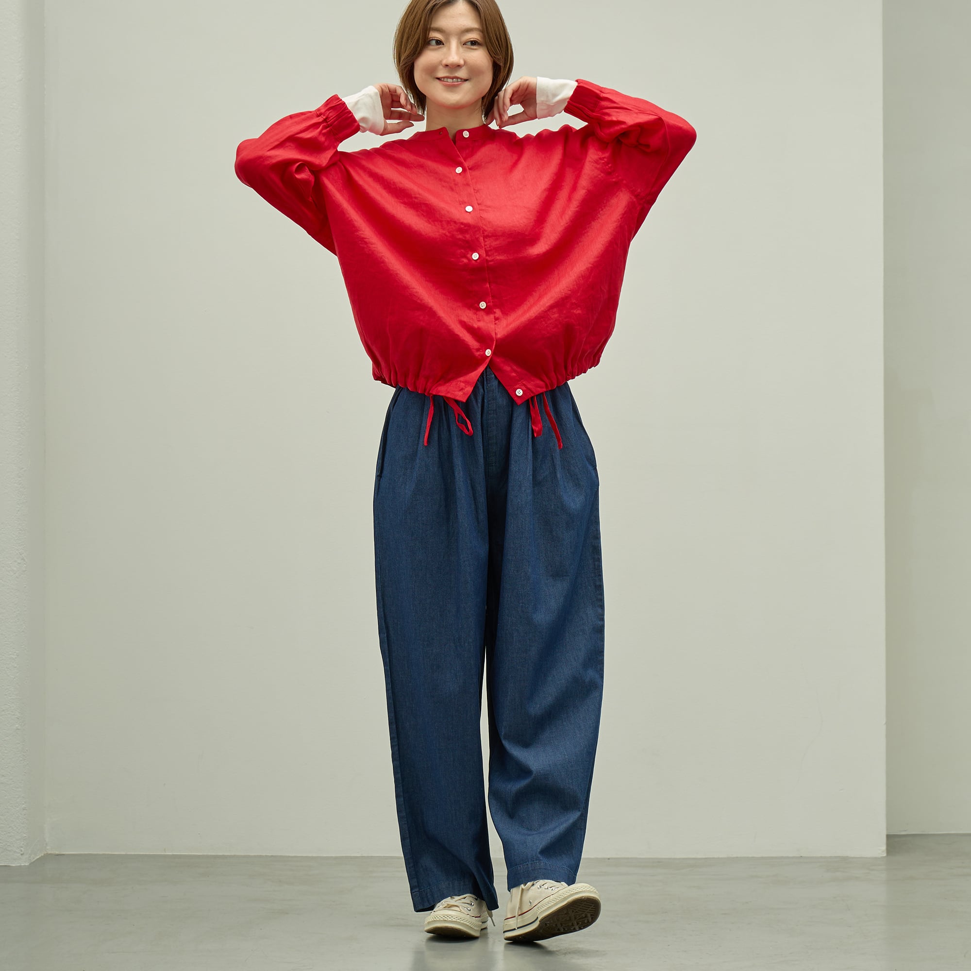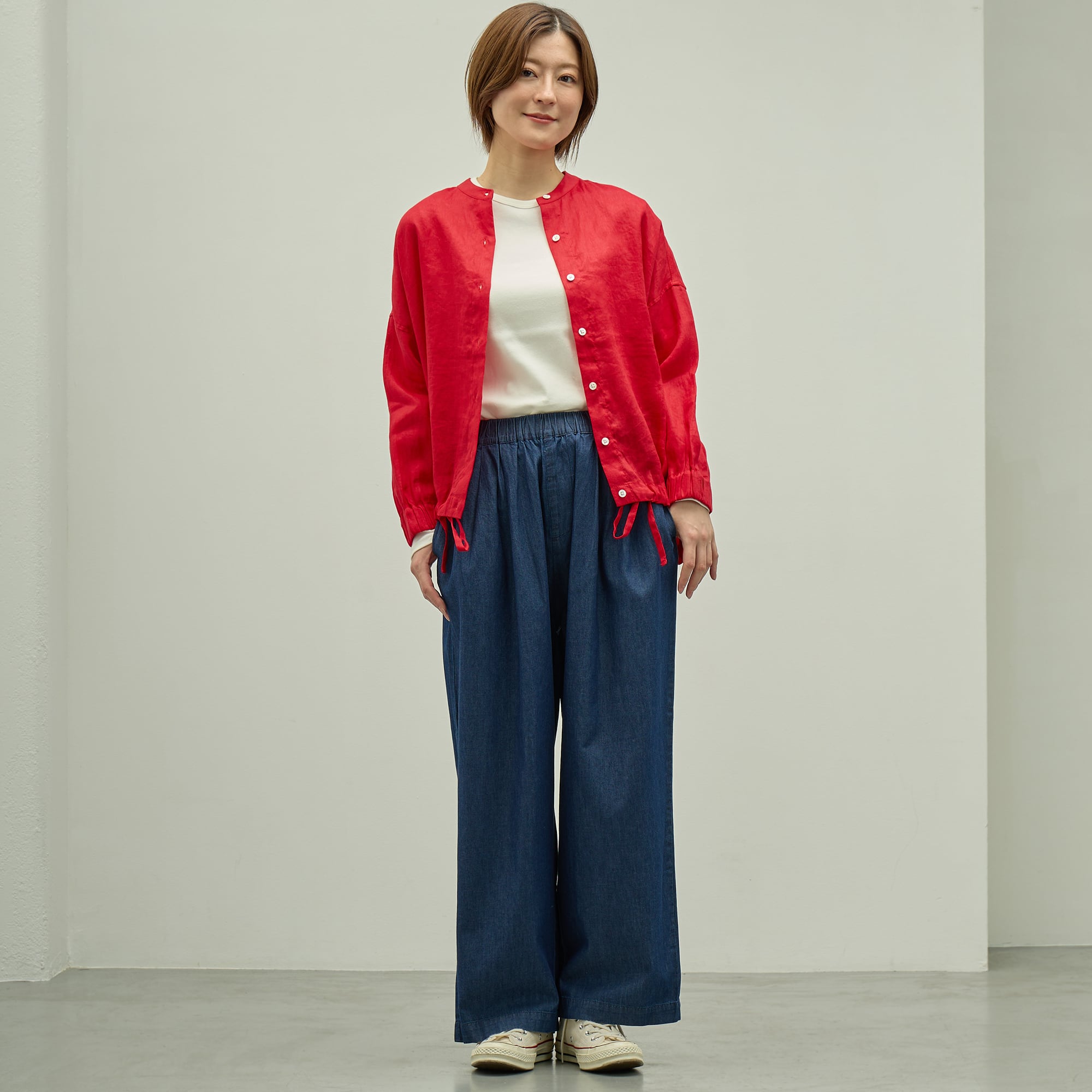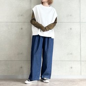 薄手のライトデニムを使用した春〜秋まで着回せるシンプルボトム。