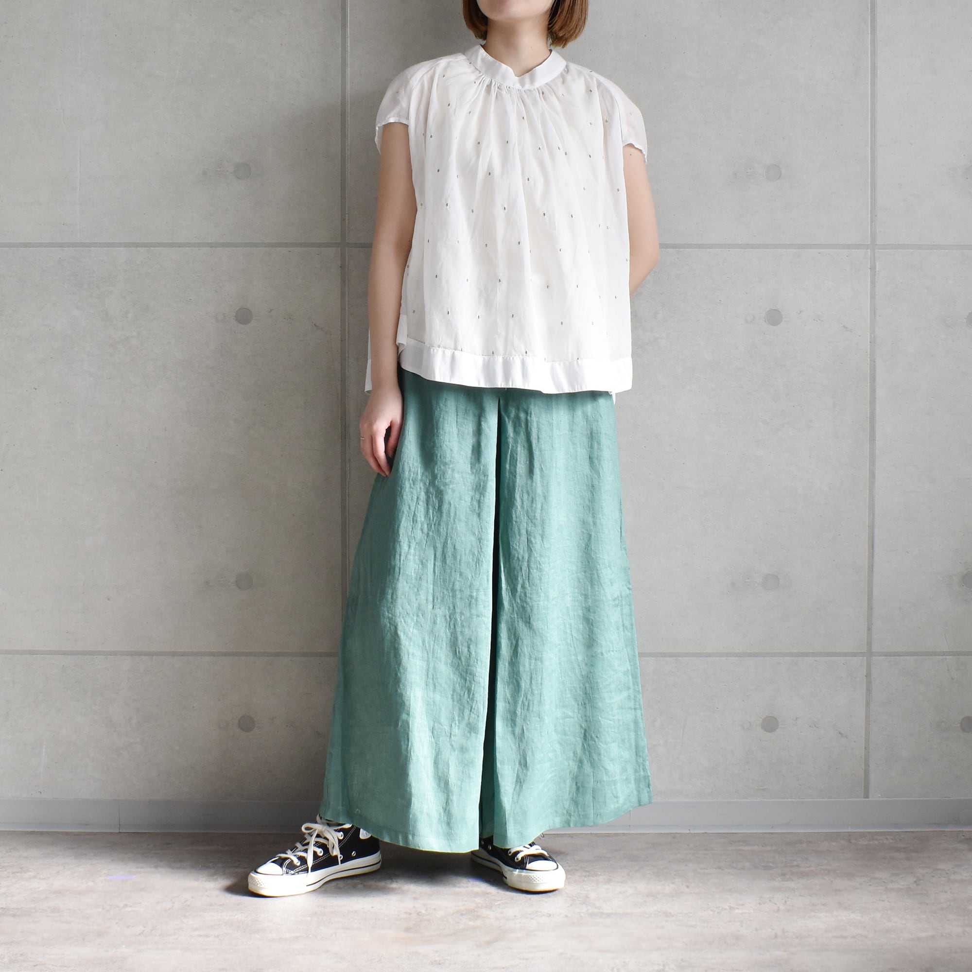 柔らかな透け感と微光沢のあるローン生地を使用した、ドビードット刺繍の一枚です。