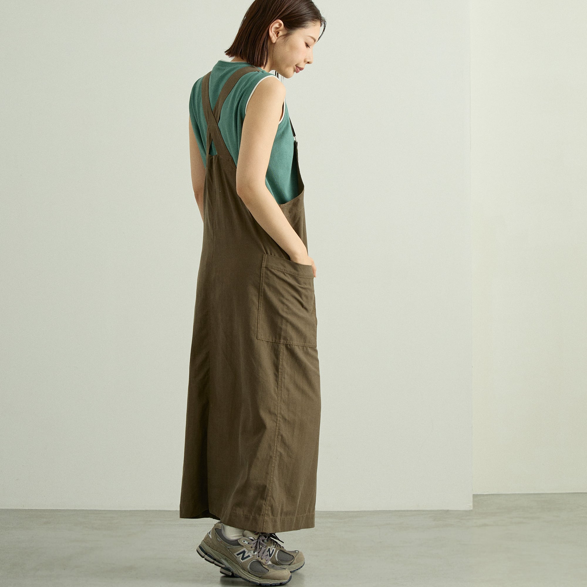 カルゼ素材のフロントZIPジャンパースカート。細見えが叶うIラインシルエット。