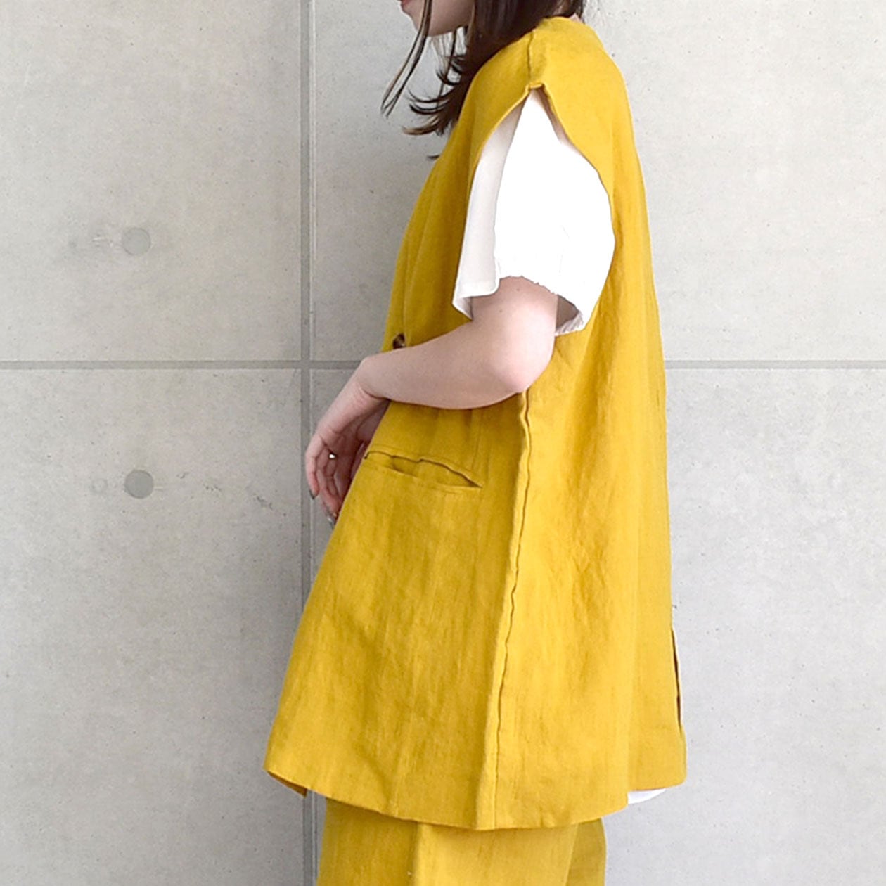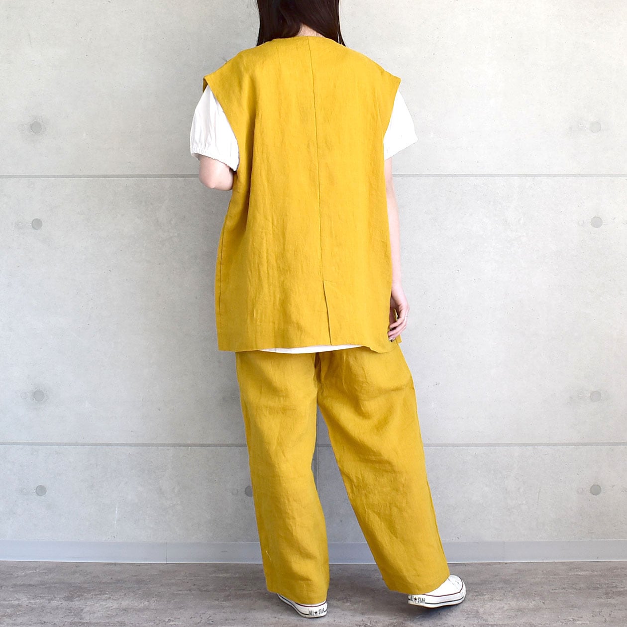 ノーカラーにすることでコーデの邪魔にならず、気兼ねなく着れるカジュアルアイテムに。