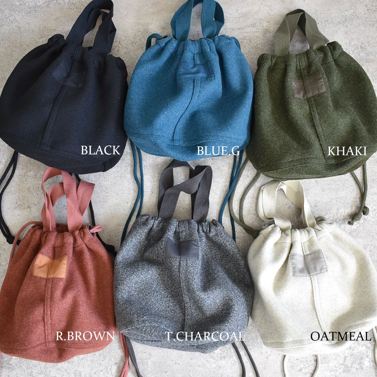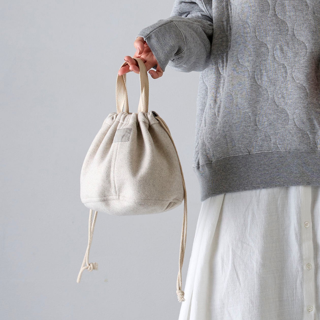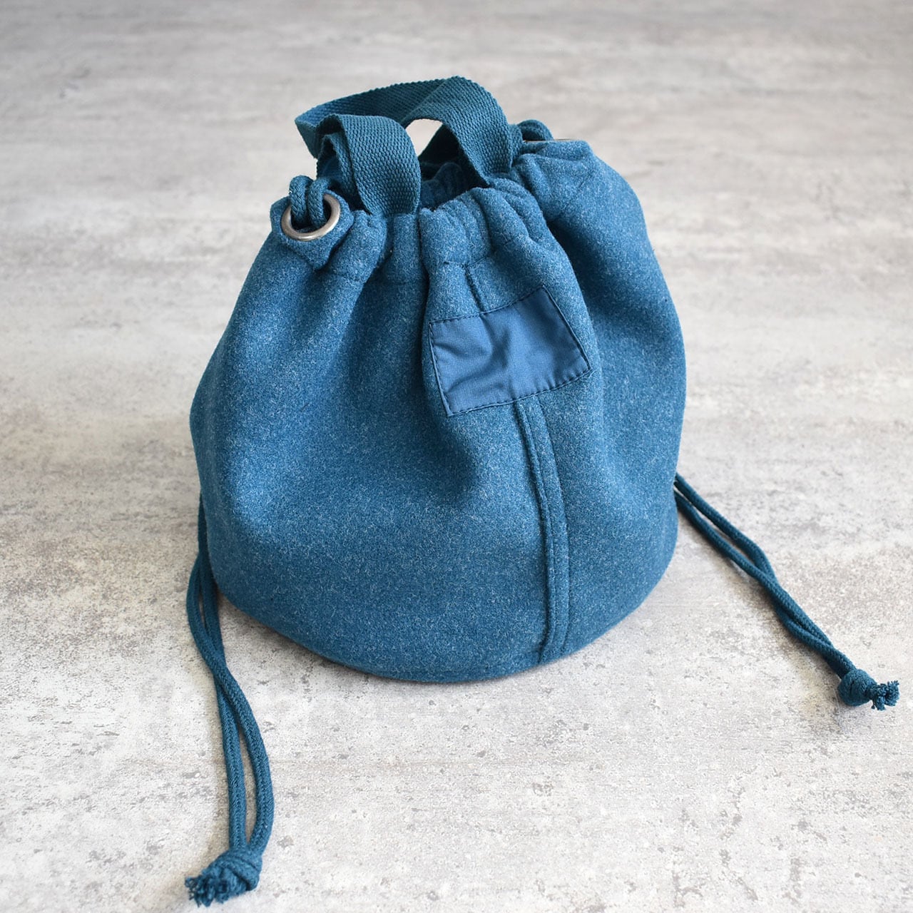 軍もののパーソナルバックからヒントを得た巾着バッグ。