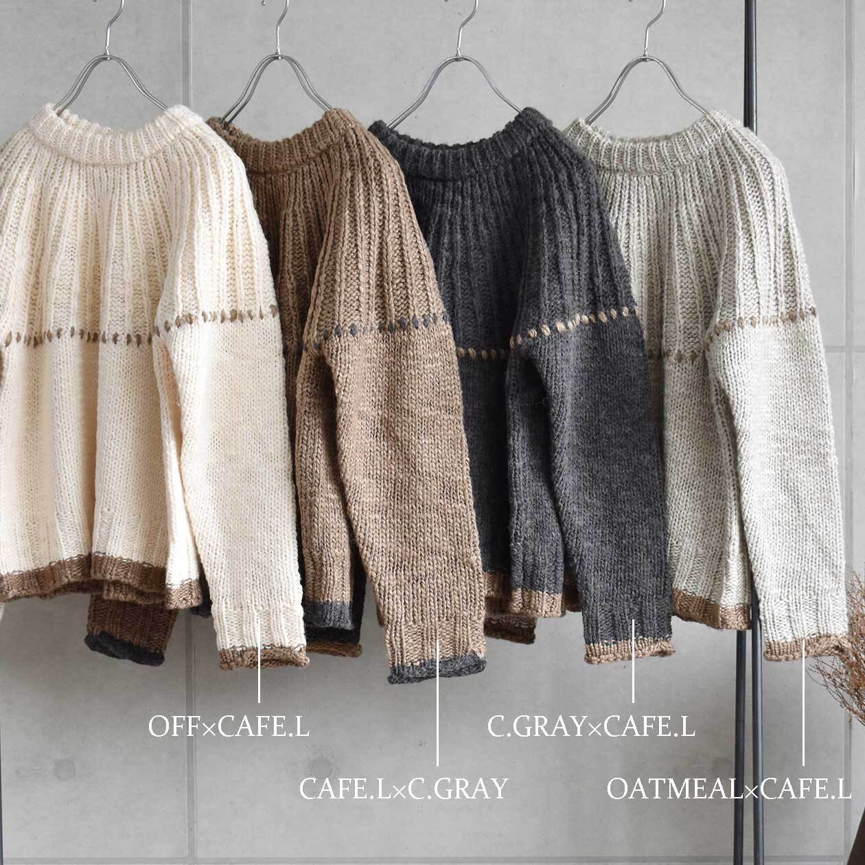 求心編み柄に配色ハンドステッチを施した仕様で1枚で存在感抜群のアイテムに!